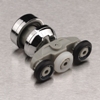 Fully adjustable pivot assembly for curved shower door, incorporating three twin-shot moulded wheels and plated cap |